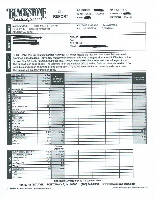 Here are the results from my Oil Analysis. Fj has 60K on it, pulled the oil at 5K interval with Amsoil 0w-20. I changed the oil to 5w-30 on my last oil change and will pull the interval at 7K and post another report in the coming months.